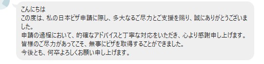 今回の申請では、申請人様からこのような丁寧なお礼をいただき、嬉しく思います。